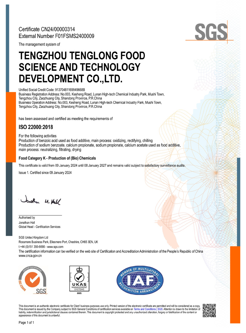 滕州市騰龍食品科技發(fā)展有限公司坐落在山東省滕州市木石鎮(zhèn)魯南高科技化工園區(qū),成立于1996年,前身是滕州市騰龍化工有限責(zé)任公司,公司專業(yè)生產(chǎn) 苯甲酸,苯甲酸鈉,丙酸鈣,丙酸鈉和醋酸鈣等系列產(chǎn)品。